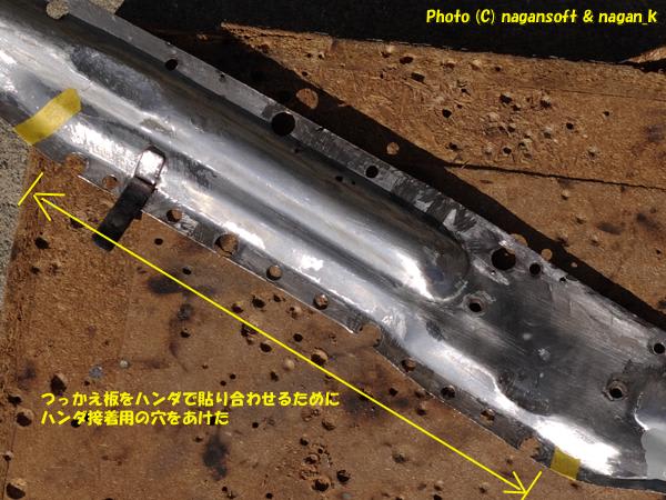 まずは、つっかえ鉄板が貼りつく部分へ、ハンダ接着できるようにスポット穴を開けました。