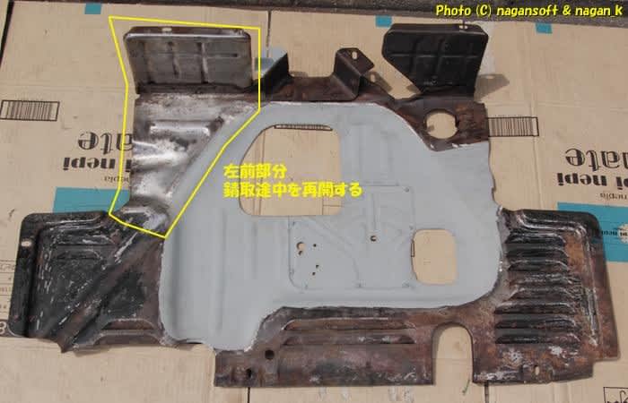4日前に錆取り中断していた、エンジンアンダーカバーの左前部分を錆取再開です。