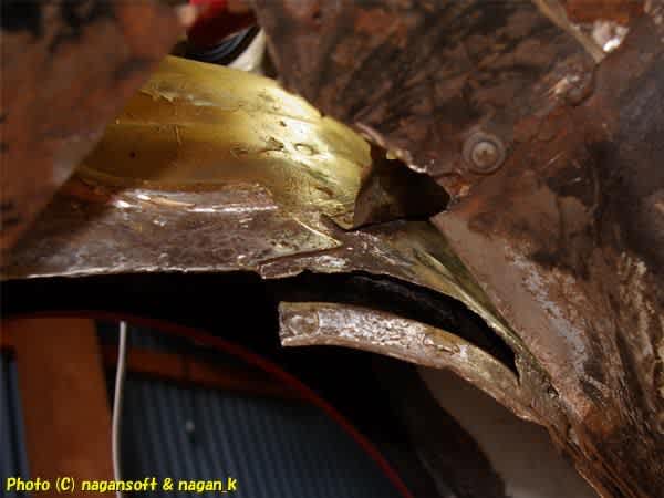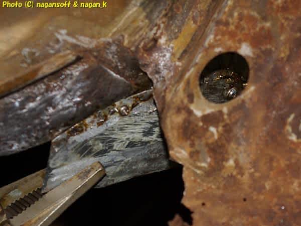 ここにパッチ鉄板をハンダで貼り付けるには、トランク側と室内足元側と、それぞれからハンダ鏝を突っ込むことになります。