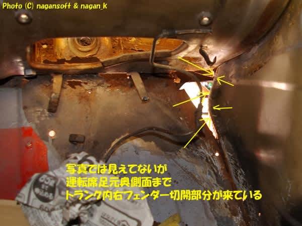 この部分ですが、運転席足元奥側面からトランク内右フェンダー奥にまたがっているのです。