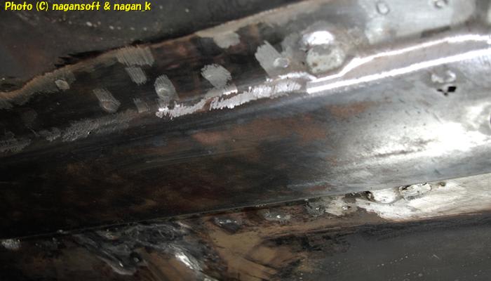 センタートンネル部分は飛び出しているので、車体下をこすったりして、前から後ろにえげつない線キズがあり、もちろんのようにそれも錆びていました。
