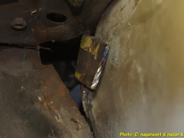 昨日に差し込んだ6mm厚み鉄板は後ろ端がトランク内バルグヘッド板(運転席との壁)の錆屑切捨て開口部を突き抜けて室内へ入ってます。