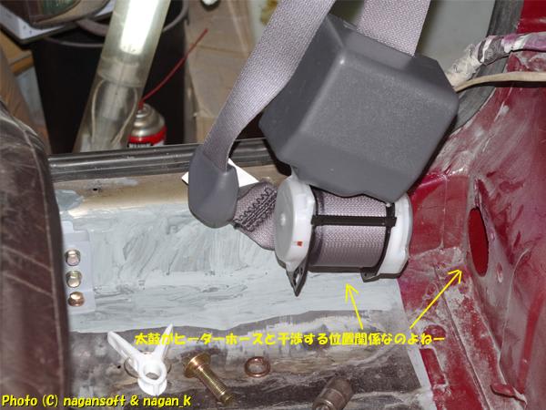 巻き取りシートベルトを取り付けるとヒーターホースと干渉するのよねー。