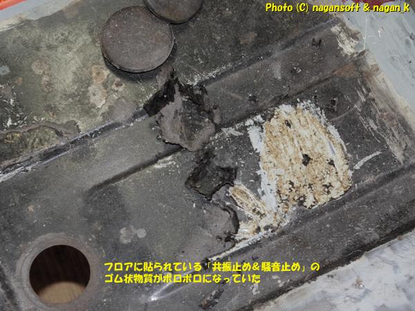 すると、フロアに貼り付けられている「共振止めと騒音対策」のゴム状シートがボロボロになってました。
