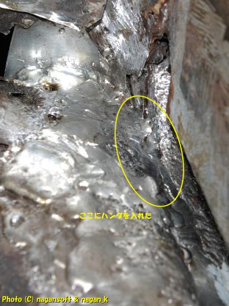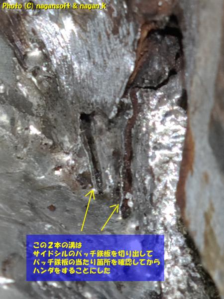 このちょっと奥にも鉄板合わせ部分が露出しており、ハンダを入れたい衝動に駆られたのですが、この部分はサイドシルのパッチ鉄板が触れる部分かも知れないと思い直しました。