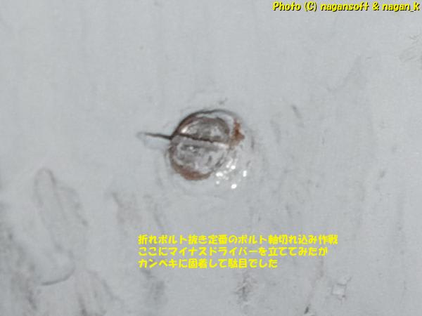 先のボルト穴と同じように、CRC556を吹き込んで、今度は細めのマイナスドライバーを折れボルト軸に当ててハンマーで叩いてみました。
