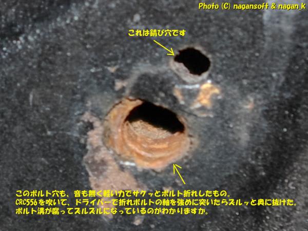 もう一つのボルト穴は、CRC556を吹いて折れたボルト軸を軽く突いたら奥に抜けちゃいました。