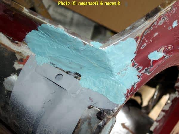 右前フェンダー上トランク縁部分です。溶接団子削って錆取りして錆転換してシール入れてこの状態になっています。