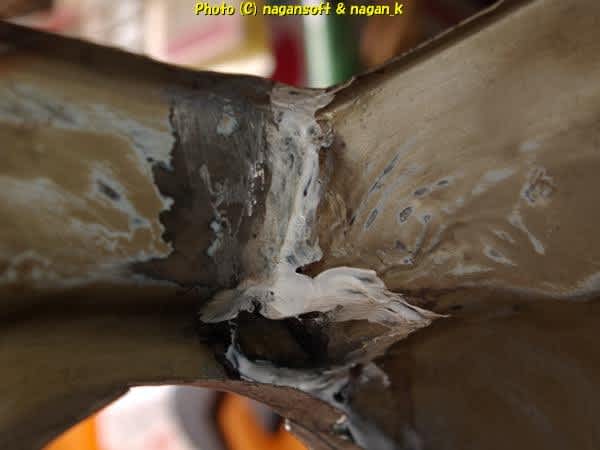 錆が先で塗装にクラックが入っていたのか、クラックから水が入って錆びたのかはわかりません。ともかくたとえ小さいクラックでもその下はしっかり錆びているってことですよ。
