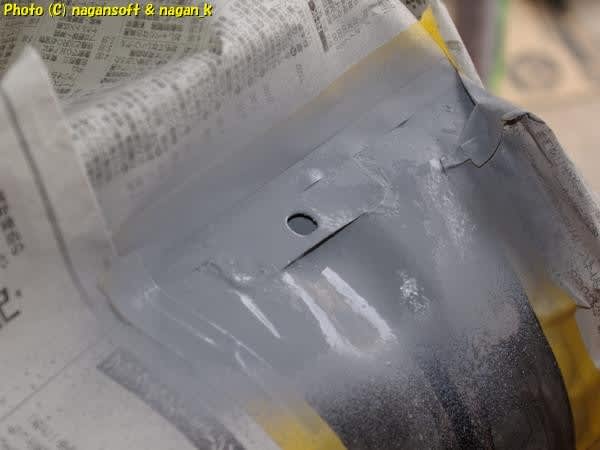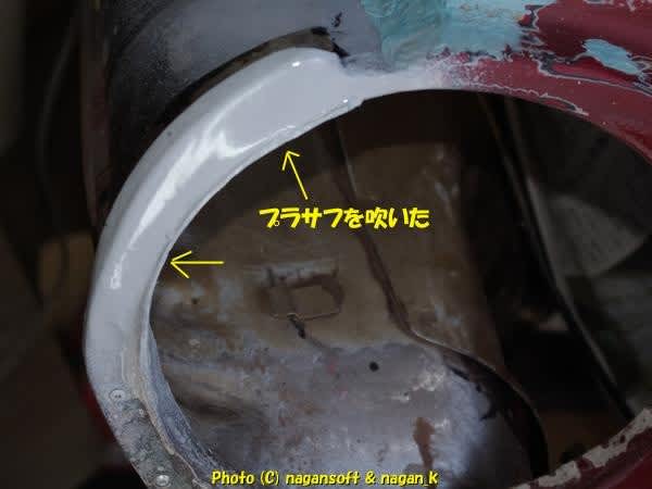 まずは、フェンダーが被さる部分にプラサフを吹きました。