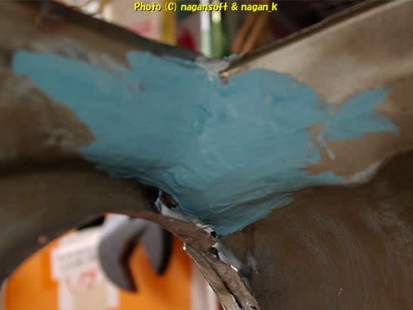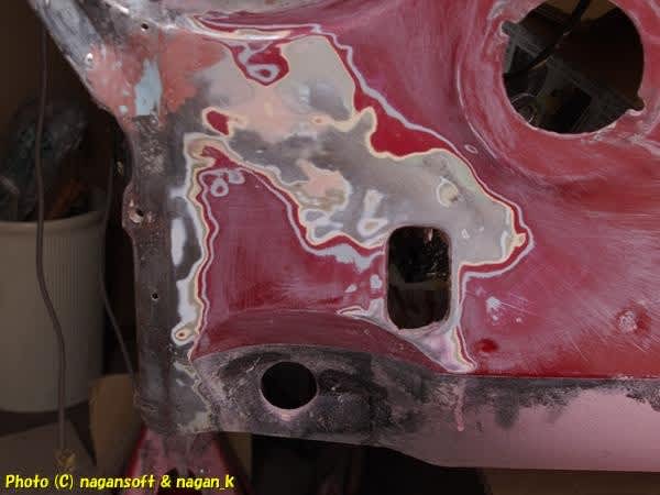 といっても鉄板がシワシワなのでそれをどうこうできるスキルが私にありません。ごまかすというか対策仕事してはシワシワを埋めるパテ仕上げになります。はあーっ蒲鉾練り職人になるってことです。