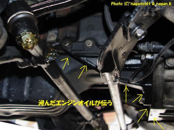 エンジン前のほうからオイルパン縁を伝ってミッションまでオイル汚れがあるのです。