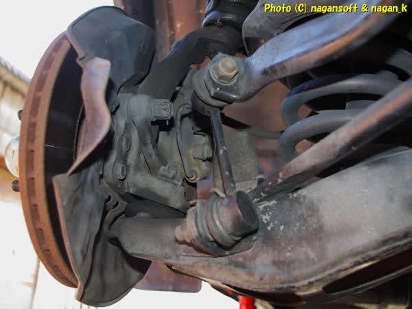 スタビライザーリンクを揺すります。サスペンションの張りで突っ張っているのですが、それでもポールジョイントを引き抜く方向に揺すってみたり左右に首を振ったりして確認してみますが、ガタはなさそうです。
