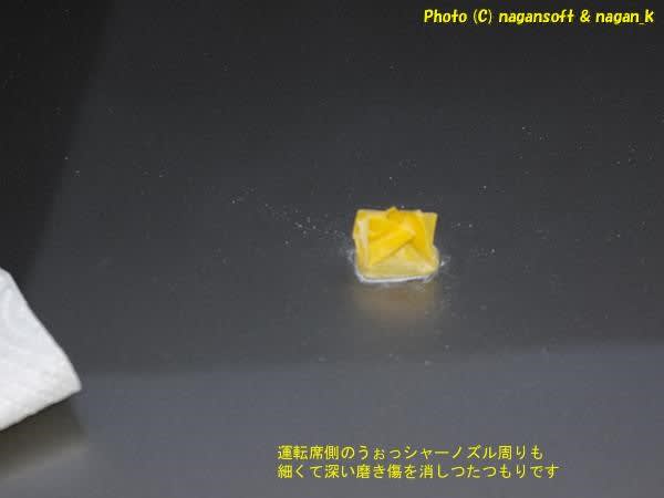 運転席側のウオッシャーノズル周りと、ボンネットの右側1/4の範囲を細いキズを探して研磨です。