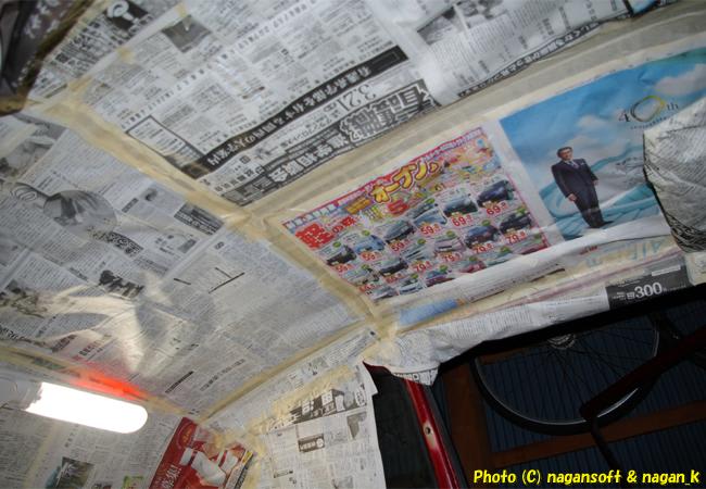 いやー、天井に新聞紙を貼るのって難しいわー。