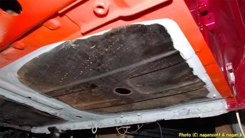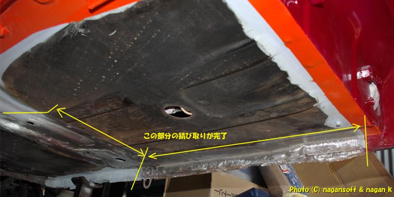 「右後ろサイドシルの車体裏内側」のサビ取り、そして、後回しにしていた「室内梁運転席側の車体裏部分」のサビ取りを完成です。