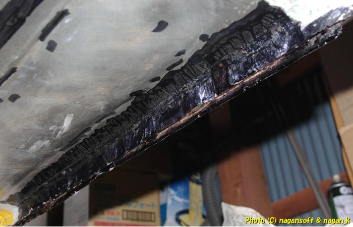 この隙間ですが、スバル組立工員お得意の練り物(おそらくパテ)が、室内側からぐいぐいと押し込まれてこの位置ぐらいまで届いているのです。