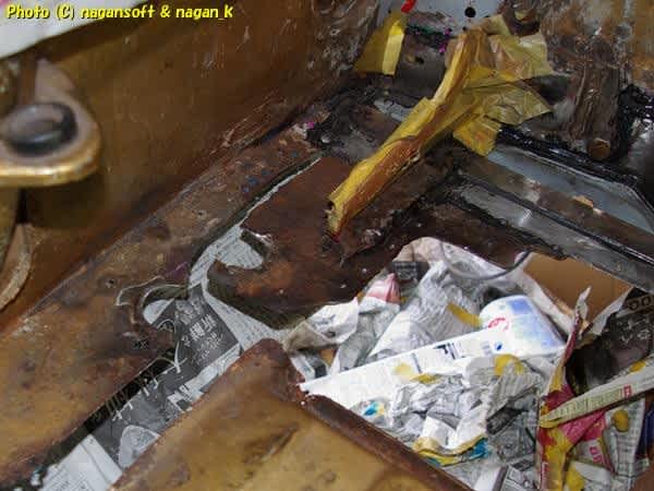 トランク床錆クズ切捨てするときに、ケーブル通し穴位置がわからなくなってはいけないので今まで穴の輪郭一部を残していました。