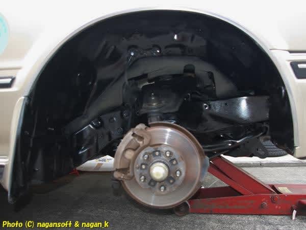 車をジャッキで持ち上げてウマをセットして、前輪を取り外します。
