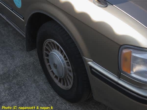 右前輪タイヤにて「あらっ。これはリヤタイヤと同じで側面変形しているよ」と新発見です。それの確認ですよ。
