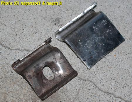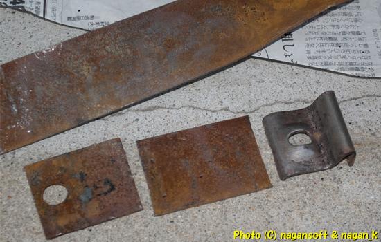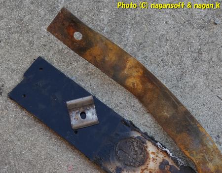 下の黒色は、R-2の腹に前オーナーが貼りつけていたやつです。こいつは2.5mm厚です。黒色は以前に私が磨いた時にサビ止めのつもりでとりあえずシャープラ塗っただけで、錆びていることに違いはありません。