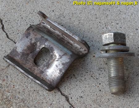 右のボルトは、リヤサスペンションメンバを車体に固定するボルトです。ある意味で超重要部品です。