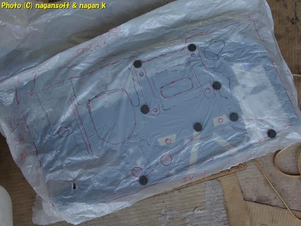 トランク床を切り取る前にビニールを裏から当てて位置を写し取っています。