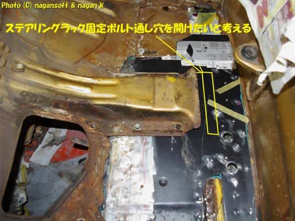 ステアリングラックのボルト固定通し穴2箇所は、トランク中央梁のボルト通し穴なんです。つまりあと2箇所の穴を開けたらいいんです。