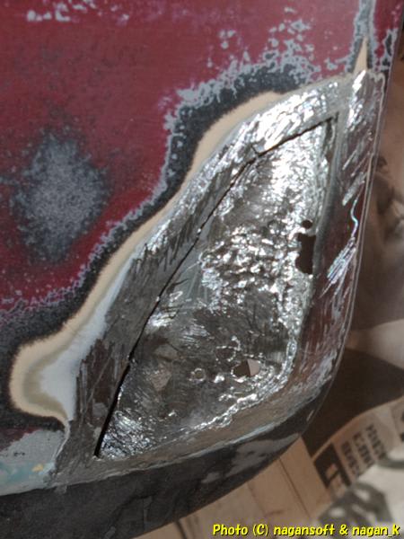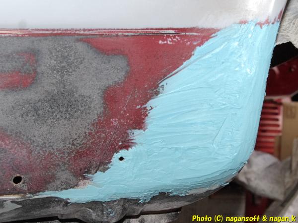 - 左サイドシル後ろ先端錆び切開部になすくったパテの整形