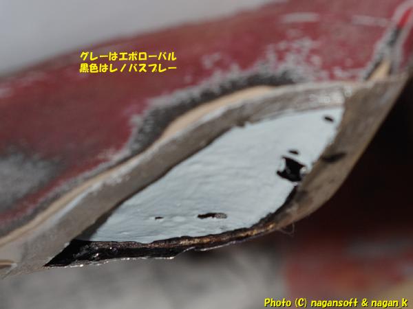 研磨した部分にサビ止め塗料(エポローバル)を塗り、隙間から奥を狙ってサビ転換剤(レノバスプレー)を吹き込みます。
