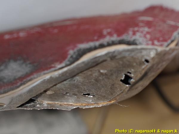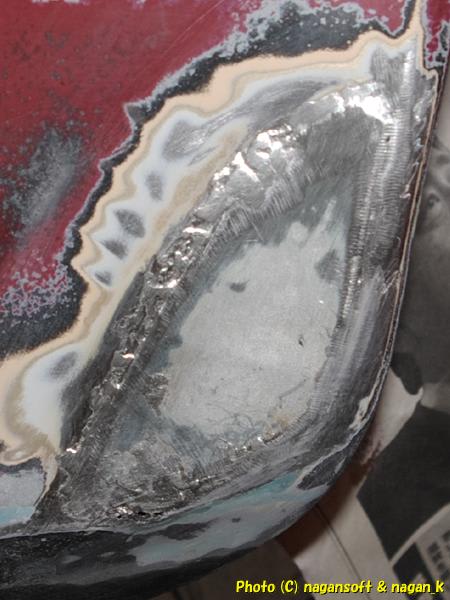 このサビ穴貫通のところから、パッチ鉄板を貼りつけたハンダ部分を狙って、ジンクスプレーを吹き込みます。