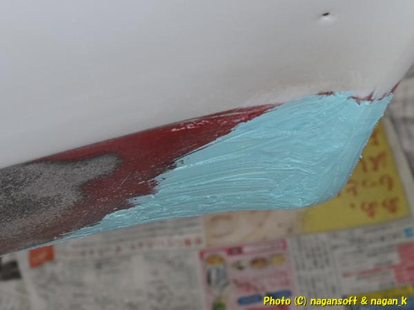 それを研磨。ちょっと気に入らない、かつ、ドリップレールのエッジデザインがちょっと気に入らない、とついで仕事追加で薄付けパテをなすくって研磨です。