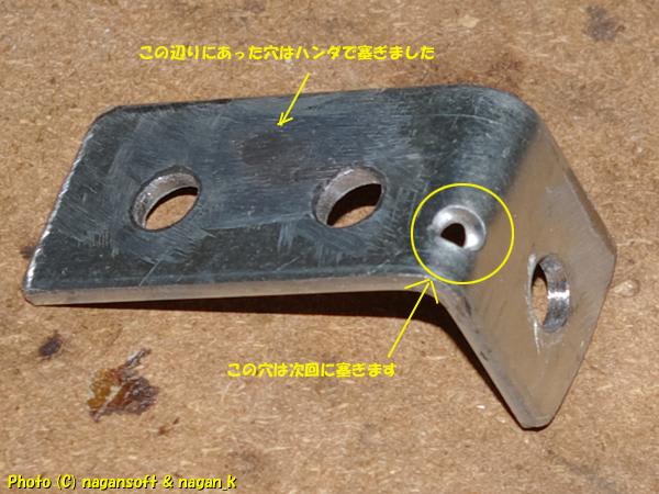床に固定するボルト穴を開けます。建築金物で開けられていた小さいボルト穴1箇所をハンダで塞ぎました。