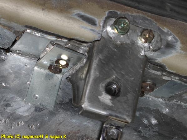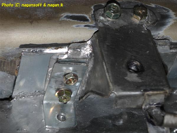 で、本来の修理としては、同じようにシートブラケットの先端を延ばしてフロアとサイドシルとの合わせ目を貫通して挟み込みスポット溶接するべきだと思います。または、ごついリベットでかしめるというのもありかな?