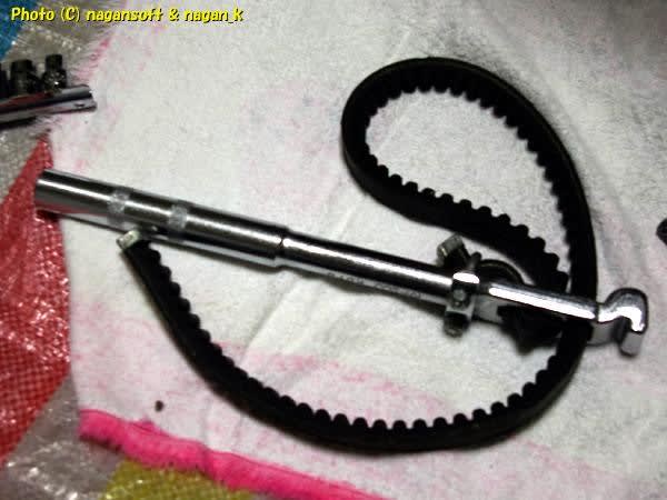 去年のプーリー脱落修理で私が締め上げたのですが、プーリー固定道具がなくてプーリーを手で固定してナットを締めたのだけど、ほんとうにそれでいいのか?自動車のナット締め上げ程度のテンションはかけたのだけど自信がなかったりよね。