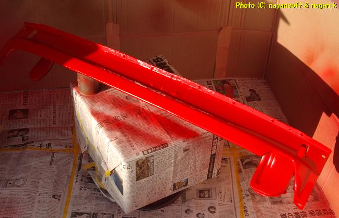 XX鉄工所レッドの塗料を持ち出しまして、エンジンルームリヤエプソンを何回も重ね塗りして塗りつぶしていきます。