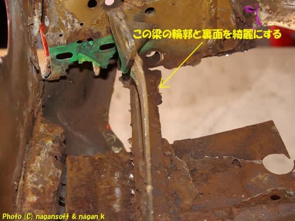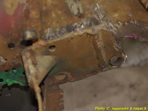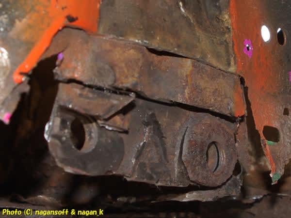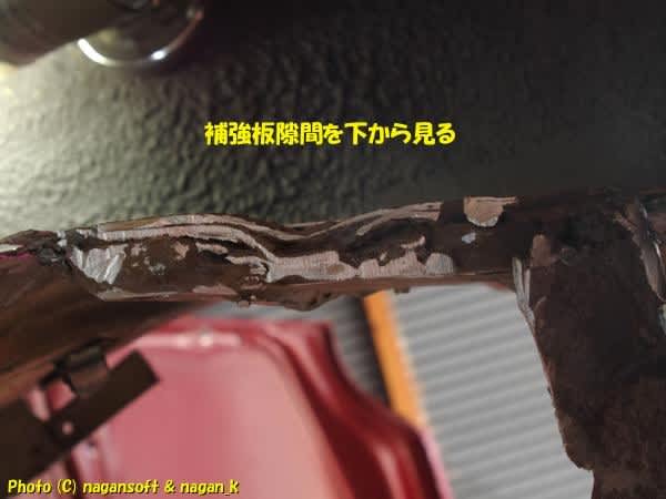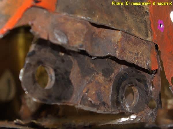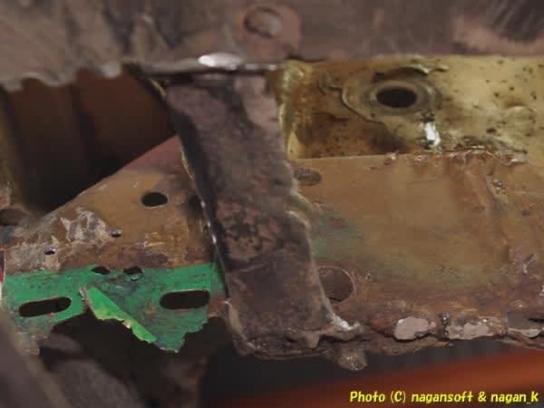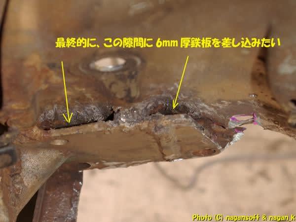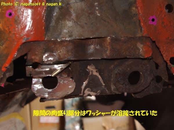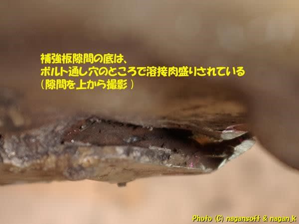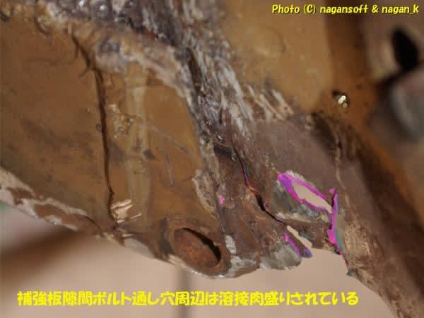 外から肉盛り溶接するがために補強板の縁にボルト通し穴が来るようにデザインしたんだろうなー。この辺りは痴呆親父の苦戦が感じられるんだよなー。ここまでしたんなら最初に赤錆撤去を徹底してくれたらよかったのになー。