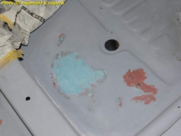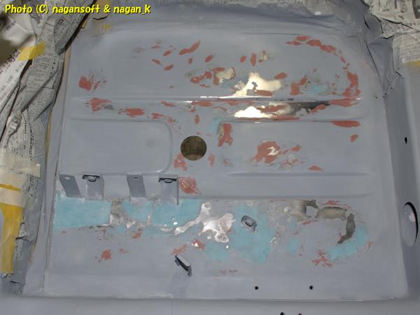 まずは、左後席床裏へパテ付けです。といってもほとんど面は出ていますのでちょろっとパテをなすくるだけです。