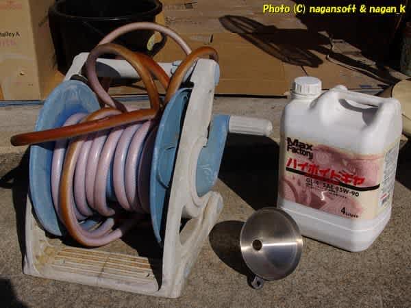 ドレンボルトが大きいので水道ホースが入る。水道ホースの先に漏斗をつけて、重力自然落下にてオイルを流しこむのがお手軽手法らしい。