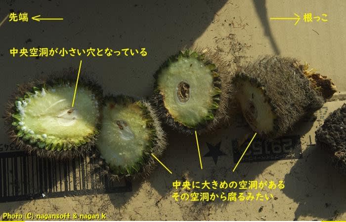 次に根腐れ部分ですよ。この部分は廃棄するのですが中がどうなっているのか興味があるので、どこがどうなっているのか輪切りスライスしてみました。