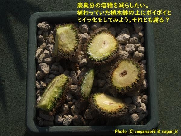ミイラになってしぼまへんかなー、または朽ちてなくならへんかなー。と考えて植わっていた鉢の上にポイポイと並べました。