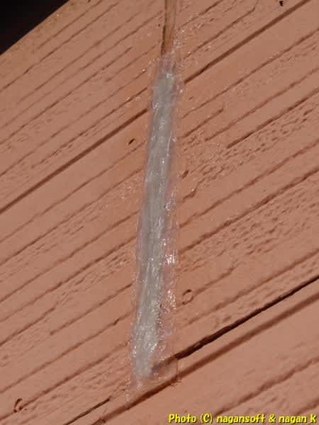 魚釣りで使うタモ網の柄5.4mの先にパテヘラをテープで固定しまして、そのヘラにシリコンシールを付けて2階の窓から身を乗り出してなすくる作戦です。