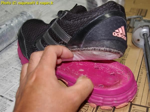シーラントを多めに塗りつけて靴底を押し付けます。