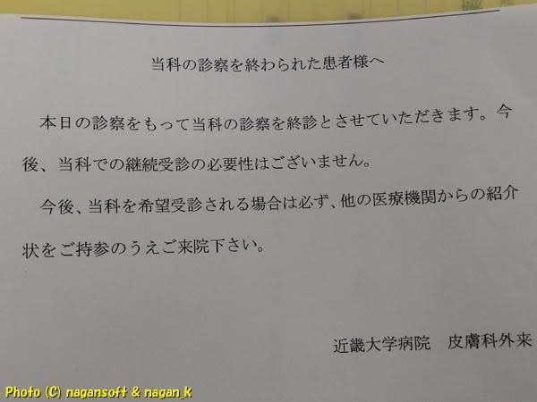 えーっ。来年に近畿大学病院移転で大きい新しい病院になるから、そこで最新医療機器でやりとりするのを楽しみにしていたんだけどなー。と、ブツブツ…。