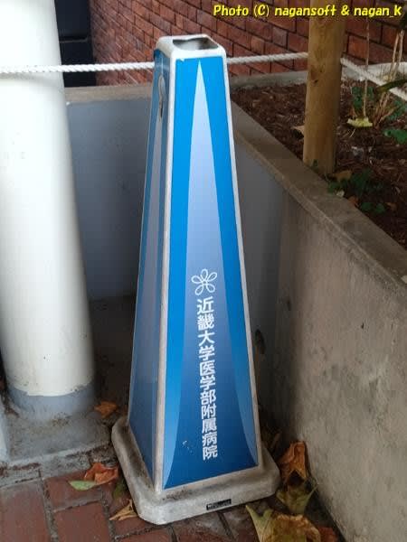 ええもん。ロビー入り口横に置いてある車侵入防止ポール(大学病院の名前入り)を撮影しておくもん。