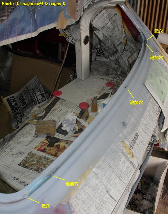 次は、ゴムの水抜き穴と車体の水抜き穴の位置確認です。