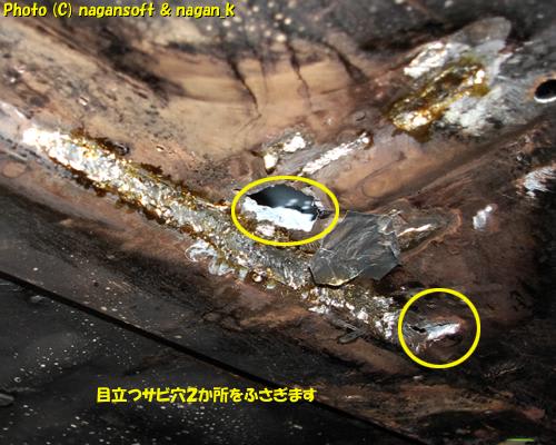 室内から塞ぐことができるサビ穴なら楽勝なんですけどねー。センタートンネルとか梁の部分は袋になっているので、車体下からゴソゴソとハンダしないといけません。