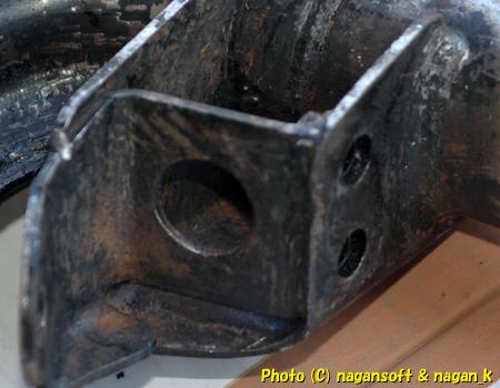 トレーリングアーム付け根のボルトが立て込まれている周辺