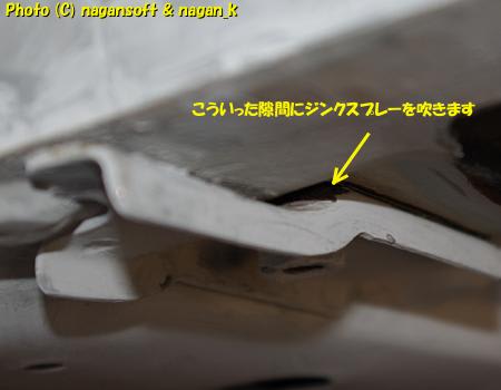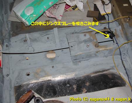 室内のセンタートンネルの袋部分にジンクスプレーをシュー。