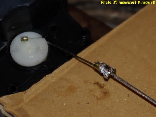 手元にポンコツマイカーのアクセルワイヤーを自作したときの部品があるんです。